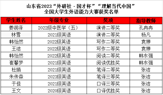 11月4日-5日,由山东省教育厅指导,山东省本科教育大学外语教学指导委员会、山东省本科教育通用外国语种类专业教学指导委员会、山东省本科教育非通用外国语种类专业教学指导委员会主办的山东省2023“外研社·国才杯”“理解当代中国”全国大学生外语能力大赛在山东大学落下帷幕。我校选派9位选手参加英语组比赛。经过激烈角逐,我校选手获二等奖6项、三等奖2项、优胜奖2项,英语专业2022级学生韩怡然、中医学(五)专业2022级学生姜润泽晋级全国决赛。