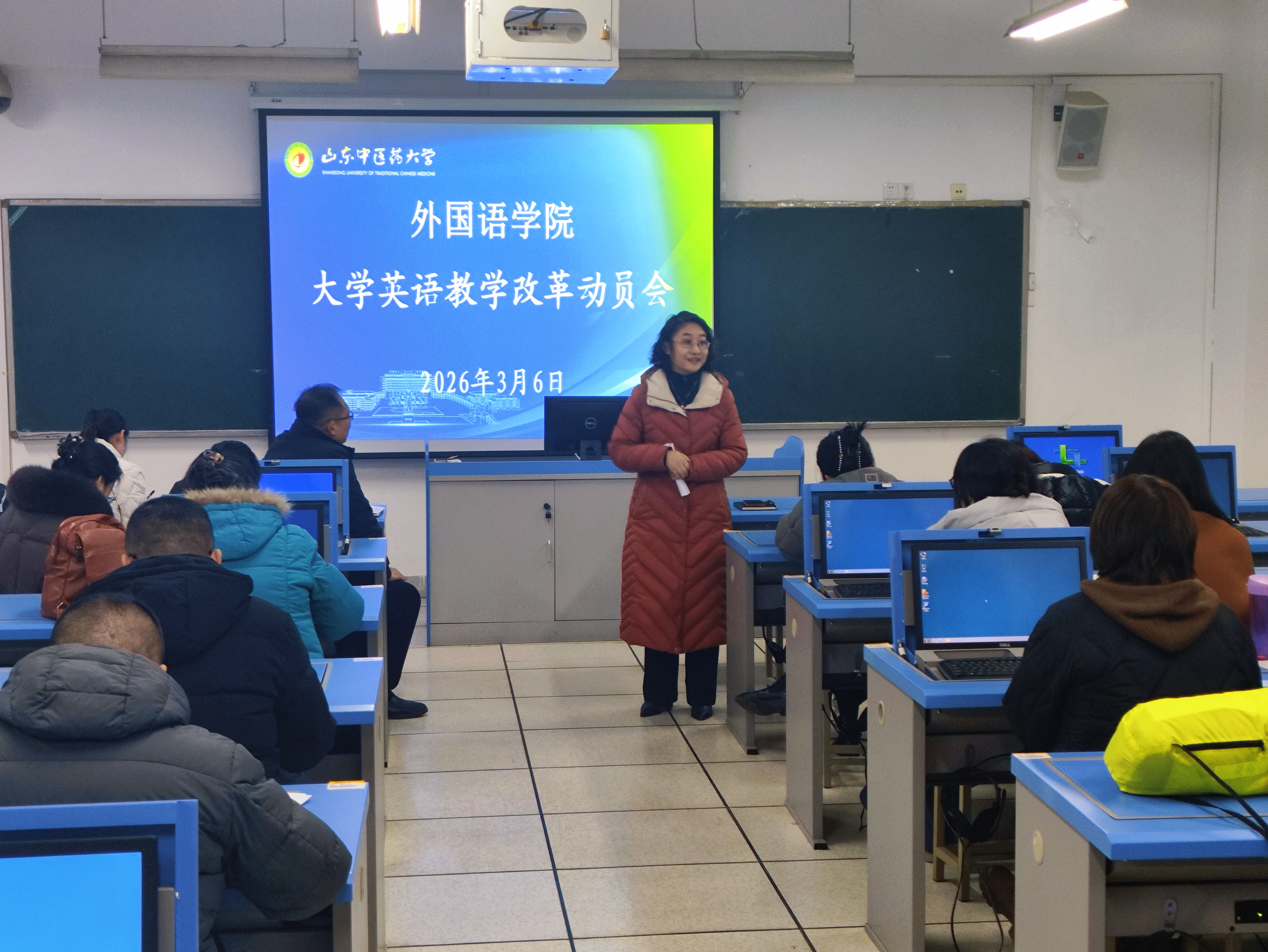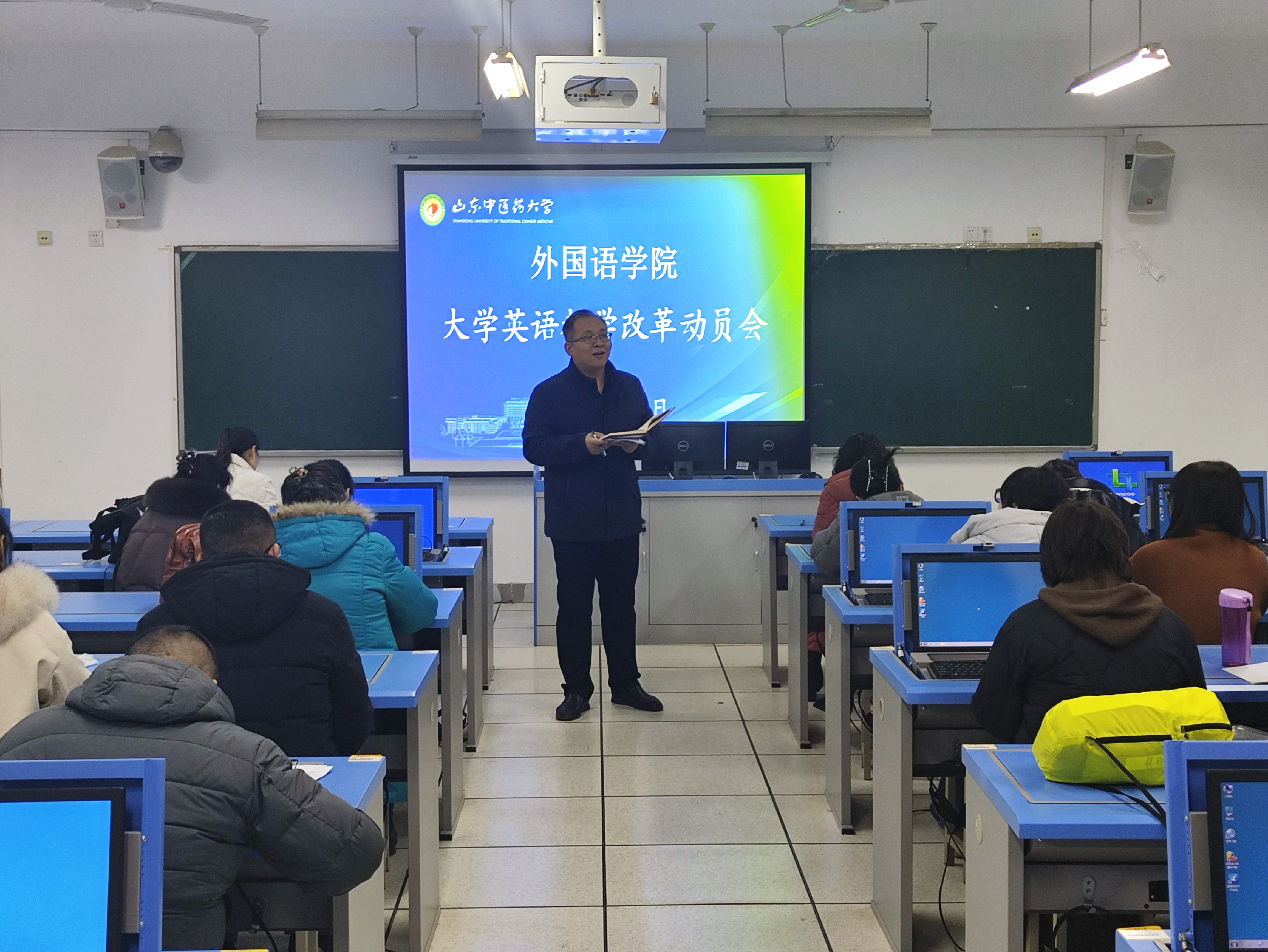 在华佗楼2号语音室召开大学英语教学改革动员会。院长苏娜娜主持会议并讲话,副院长李成华参加会议。