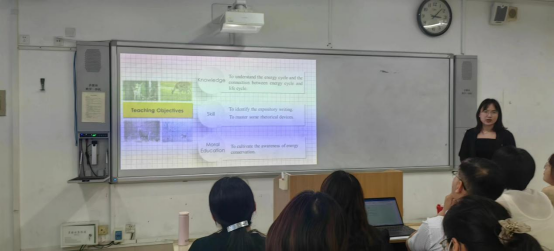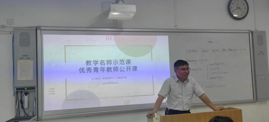 学校青年教师教学比赛二等奖选手、学校第五届“京鲁杯”课程思政教学比赛优秀奖获得者、大学英语教研二室杨海英老师主讲“Deer and Energy Cycle”一课。她以日本核污水排放事件引入课文主题,深入浅出地分析课文的框架结构和内在逻辑,用具体实例讲解隐喻、明喻、类比、平行结构等修辞手法,并扩展了碳达峰和碳中和等热点知识,做到了融盐于水、育人无声。曲悃和王丽君两位老师在点评时指出,杨老师的公开课充分展示了青年教师的教学能力和精神风貌,板书美观整齐,授课节奏紧凑,条理清晰,教学内容全方位体现了“两性一度”的要求。