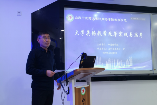 主办,大学英语教研一室承办的“大学英语教学改革实践与思考”教学沙龙活动在2308教室举办。副院长陈战参加活动,大学英语教研一室姚秋慧老师、徐丽老师做报告,教研室主任曲悃主持活动。