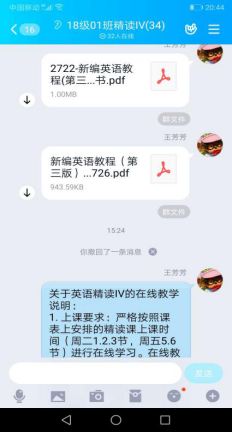 王芳芳老师说:之前建设的英语精读在线课程,主要作为教学辅助平台使用。此次开展线上教学,在线学堂成了主角,发挥了非常重要的作用。学生们使用超星学习通有一定的经验和基础,使得开展在线教学更加便利。老师和学生以全新的方式教和学,充满了新鲜感和探索新领域的好奇。虽然我们相隔很远,但感觉我们很近。