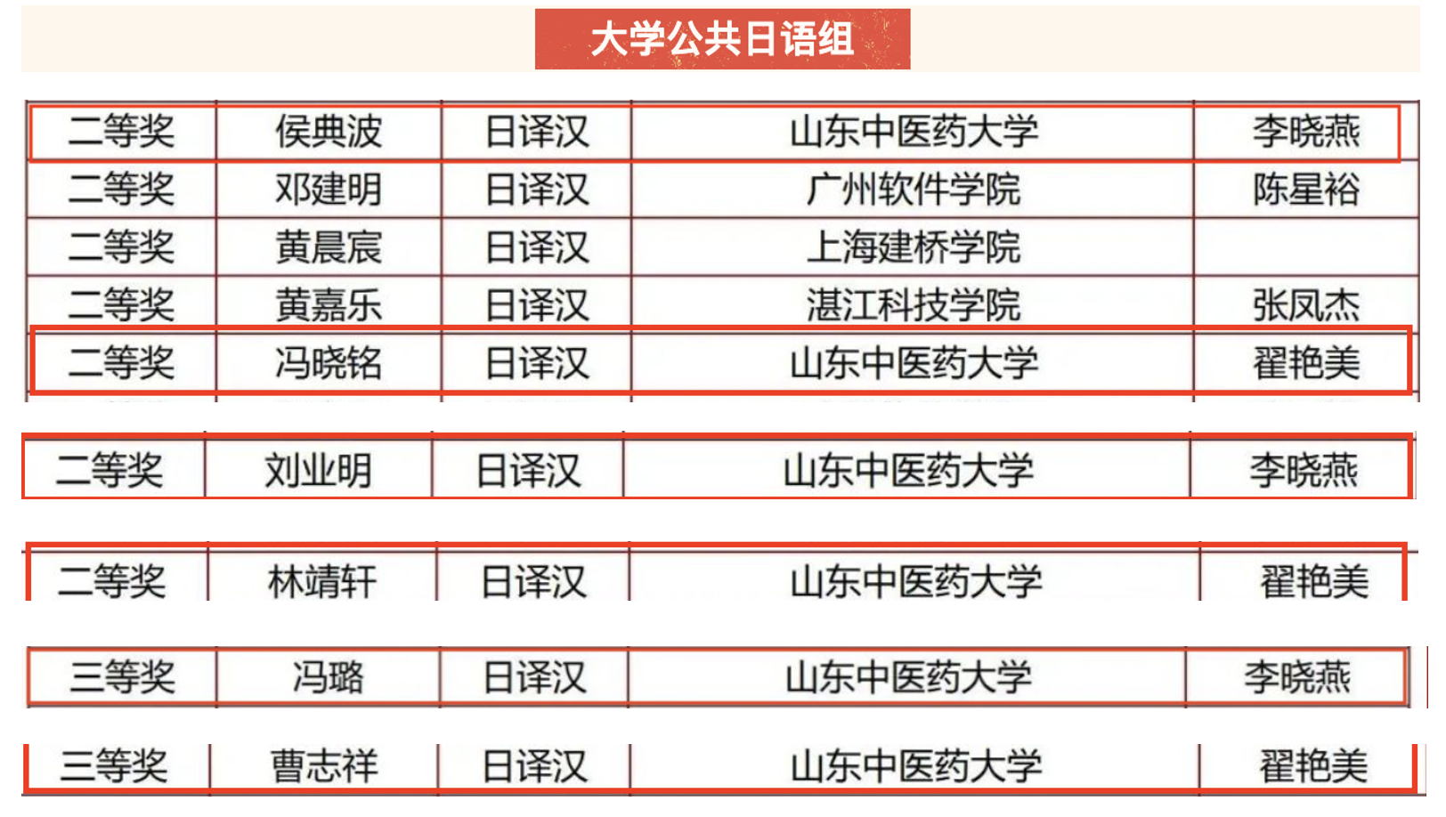 日语、俄语综合教研室教师李晓燕、翟艳美指导学生获佳绩,获本科组和大学公共日语组二等奖4项、三等奖5项,我校获优秀组织奖。