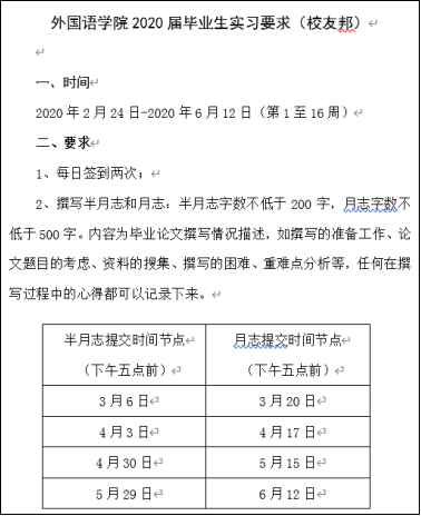 2020届毕业生实习要求(校友邦)”,就毕业论文撰写做了具体安排,包括撰写时间、撰写内容、撰写半月志及月志等一揽子计划。同时要求指导老师加强与学生的沟通交流,做好疫情防控期间毕业生论文指导工作。