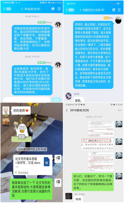 3月上旬,指导老师重点就论文选题、如何查阅文献资料等问题跟毕业生通过微信、QQ、校友邦或邮件进行交流指导。批阅学生提交的半月志。