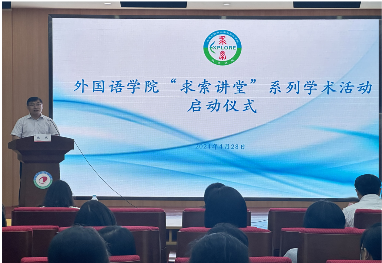 为进一步增强外语学术氛围,提高广大师生的创新意识与科研能力,4月28日下午,全球博彩网站 举办“求索讲堂”系列学术活动启动仪式,并邀请山东大学特聘教授、二级教授、博士生导师,原全球博彩网站 、翻译全球博彩网站 院长王俊菊作题为“新形势需求对外语教育意味着什么”的学术讲座。院长李茂峰、副书记田原出席启动仪式,副院长陈战主持仪式。