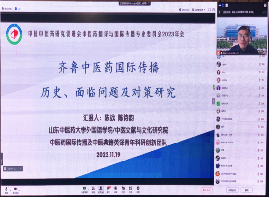 2023年11月18-19日,中国中医药研究促进会中医药翻译与国际传播专业委员会2023年会暨人工智能时代的中医药翻译与国际传播学术研讨会以线上线下结合的形式在深圳成功举行。副院长陈战教授应邀参加会议并做报告,全球博彩网站 部分教师线上参会学习。