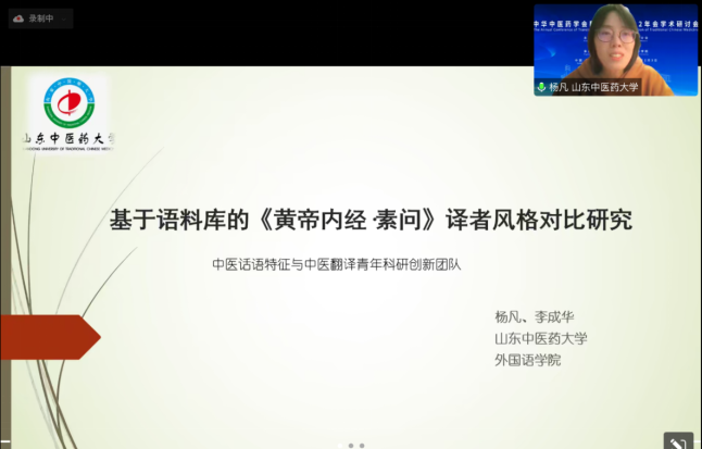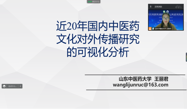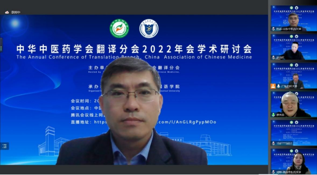 2022年12月3日,由中华中医药学会翻译分会主办、广东药科大学承办的中华中医药学会翻译分会2022年会学术研讨会以线上线下结合的方式举行。副院长陈战应邀参加会议并担任会议平行报告点评嘉宾,杨凡和王丽君老师分别作题为“基于语料库的《黄帝内经·素问》译者风格对比研究”和“近20年国内中医药文化对外传播研究的可视化分析”的报告。