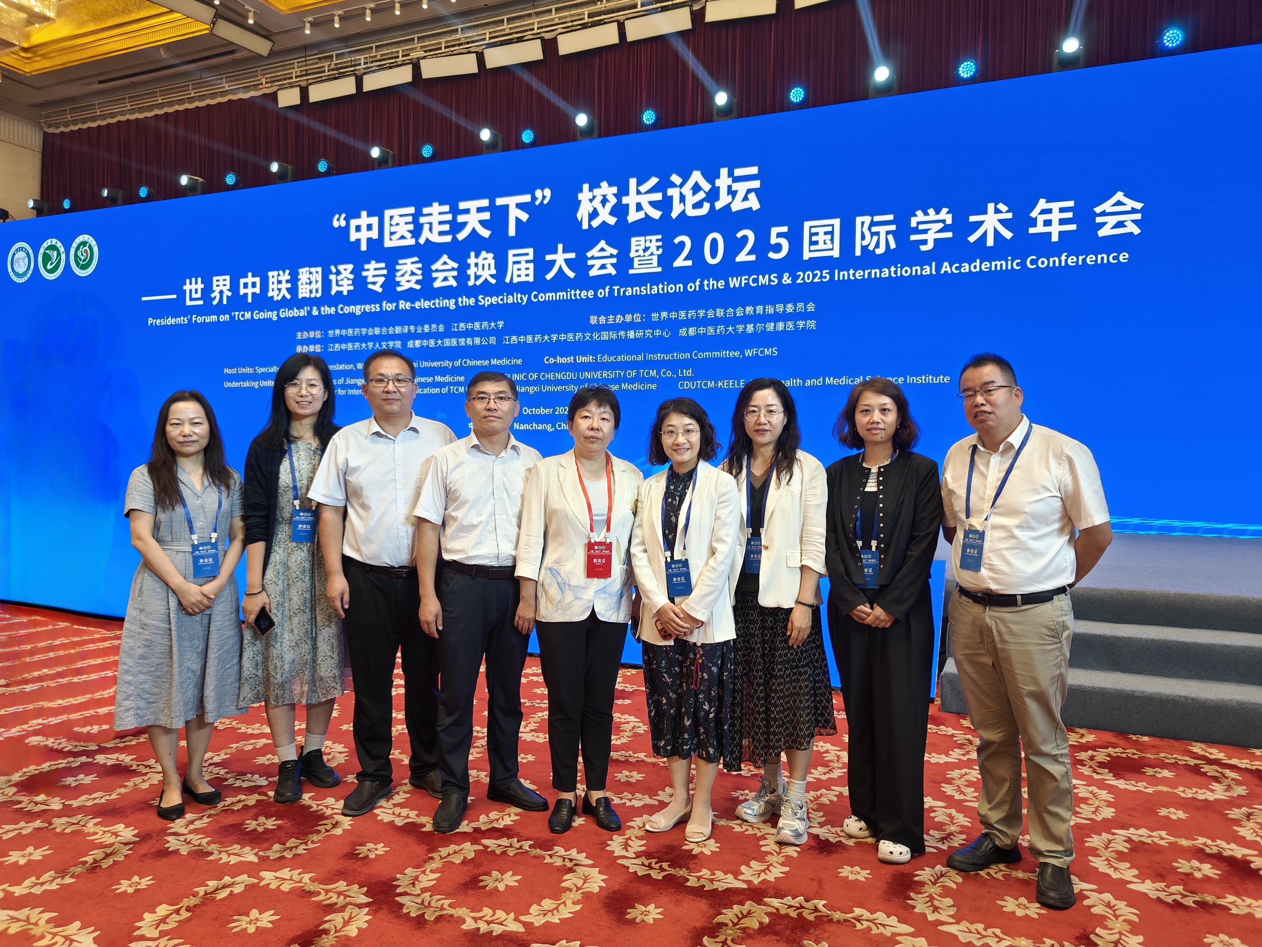 10月10日至12日,“中医走天下”校长论坛暨世界中联翻译专委会换届大会暨2025国际学术年会在江西南昌举行。副校长王琳应邀担任大会共同主席,并出席“中医走天下”品牌启程仪式。学院党委书记苏娜娜应邀参会。李成华、范延妮、孔冉冉、闵玲当选为翻译专委会第五届理事会常务理事,袁婷、张喆、王芳芳、李琳、杨凡当选为理事。