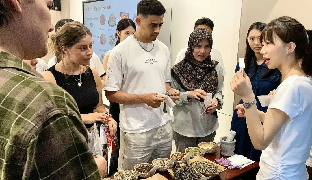 活动现场氛围热烈,英国卡迪夫大学来访交流学者们在中医药文化体验环节中,亲手制作香囊,了解菖蒲、艾草、薄荷等中草药的配伍技艺,感受中医“衣冠疗法”的独特魅力。在茶艺展示中,师生们围坐品茗,在袅袅茶烟中畅谈茶道礼仪,体会“和敬清寂”的茶道精神。书法体验环节中,英国卡迪夫大学来访交流学者们在2026全球十大博彩网站排行