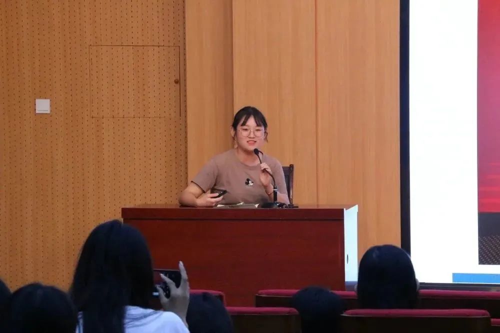 2020级02班、山东省2023年省级优秀学生干部张真娣向同学们分享学习和生活经验,大一大二全体学生参加此次宣讲会。