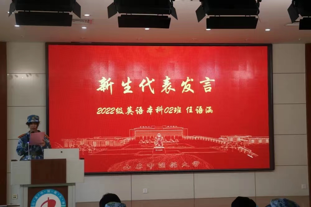 2022级新生代表任语涵进行发言,在台上回忆高中生活的点滴,畅想对大学生活的憧憬和展望,为22级新生做出了榜样表率。