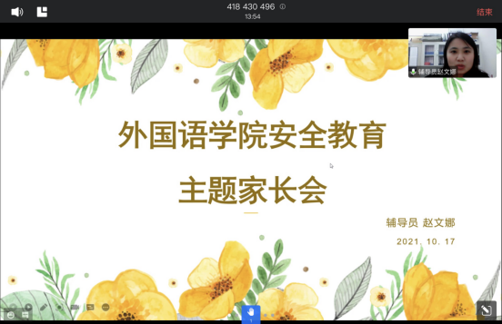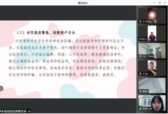 会上,辅导员通过具体事例对学生家长进行了学生交通安全、用电安全、财产安全、人身安全、防疫安全等知识的宣讲,希望家长能够配合好全球博彩网站