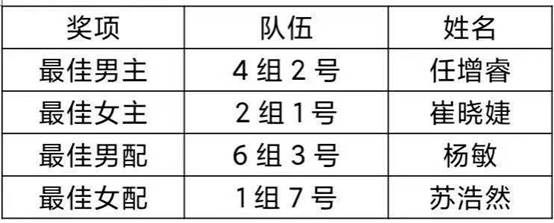 经过激烈的比拼,评选出一等奖1队,二等奖2队,三等奖3队,男、女主角,男、女配角各1人。