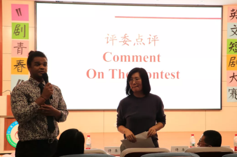 评委老师范延妮、Aaron P. Meadows对演员们的剧情选择、舞台设计、英语发音、表演效果等方面进行详细点评,对加强剧本的背景介绍、简化语言表达方面提出了宝贵的意见和建议,指舞台是另一种形式的语言学习,希望同学们通过本次比赛找到合适的语言学习方法。