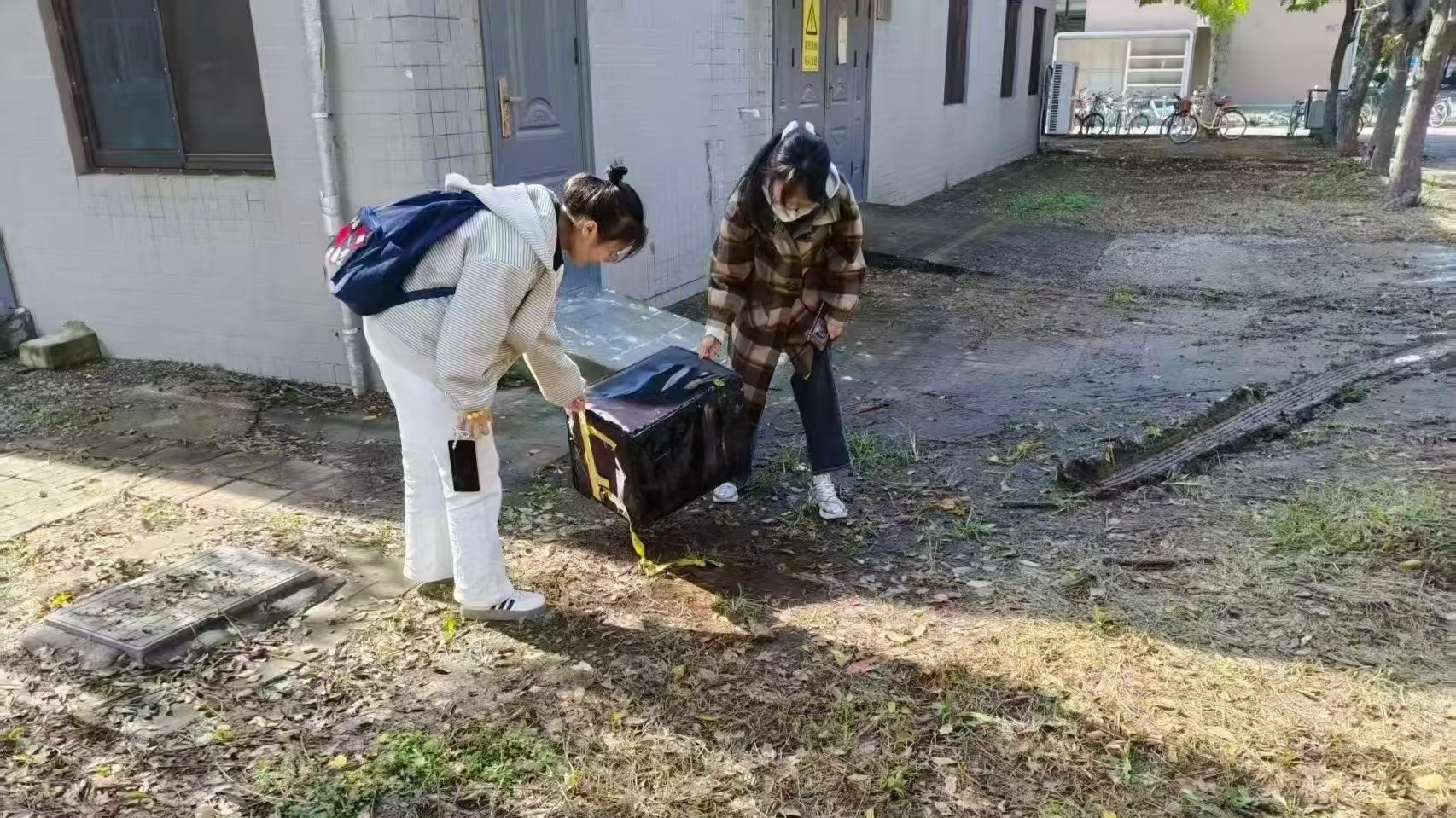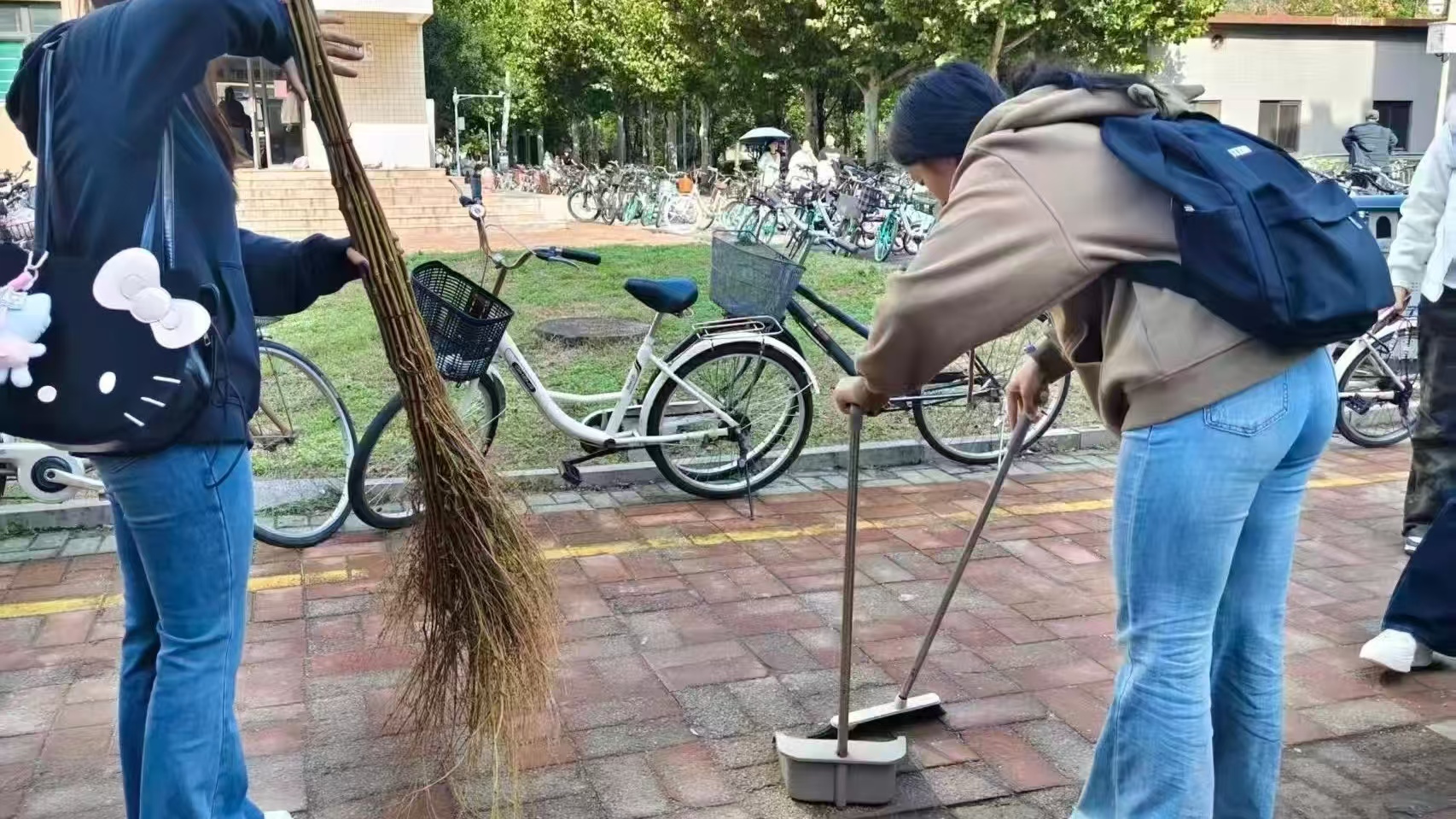 随着持续十余日的秋雨结束,深秋的落叶铺满路面,给清扫工作带来了不小的挑战。同学们分工明确、配合默契——有人负责把落叶扫集成堆,有人紧随其后进行清运,还有人细致地检查角落里的纸屑和塑料包装。整个过程井然有序,效率极高。