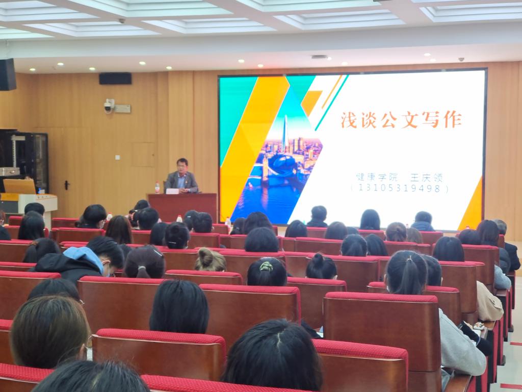 院长王庆领主讲。王院长从公文的演变历史、常用公文的分类、公文材料写作要点三个方面为同学们普及了系统性的公文知识以及公文写作重点注意事项,针对同学们最关心的“请示”、“报告”、“简历”等写作方法与技巧进行了详细地指导,使同学们对公文写作有了一个初步的认识。