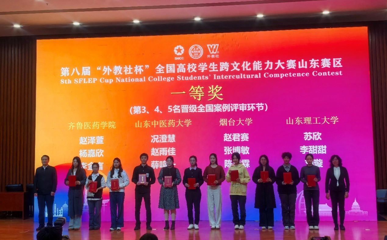 10月26日,第八届“外教社杯”全国高校学生跨文化能力大赛山东赛区(本科院校组)比赛在山东师范大学长清湖校区落下帷幕,我院教师邱冬、周茜、黄文娟指导的况澄慧、赵雨佳(针灸推拿学2024级02班)、薛鸣一(中药学2024级01班)团队荣获一等奖,晋级全国案例评审环节。
