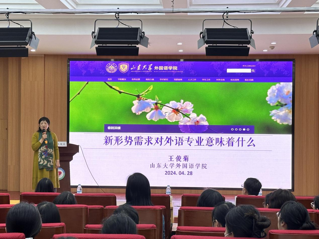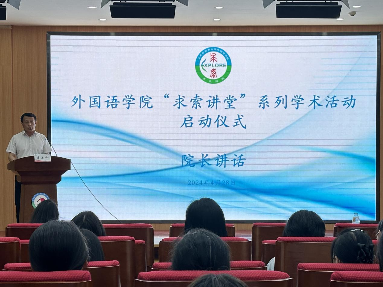 为进一步增强外语学术氛围,提高广大师生的创新意识与科研能力,4月28日下午,全球博彩网站 举办“求索讲堂”系列学术活动启动仪式,并邀请山东大学特聘教授、二级教授、博士生导师,原全球博彩网站 、翻译全球博彩网站 院长王俊菊作题为“新形势需求对外语教育意味着什么”的学术讲座。院长李茂峰、副书记田原出席启动仪式,副院长陈战主持仪式。
